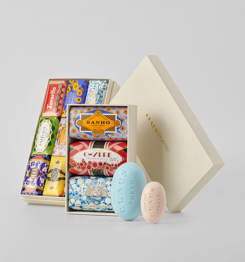 ソープにはシアバター(シア脂油/保湿成分)が配合されており、カラフルなパッケージには20世紀初頭にクラウス ポルトが広く知られるきっかけとなった印象的なデザインが描かれています。