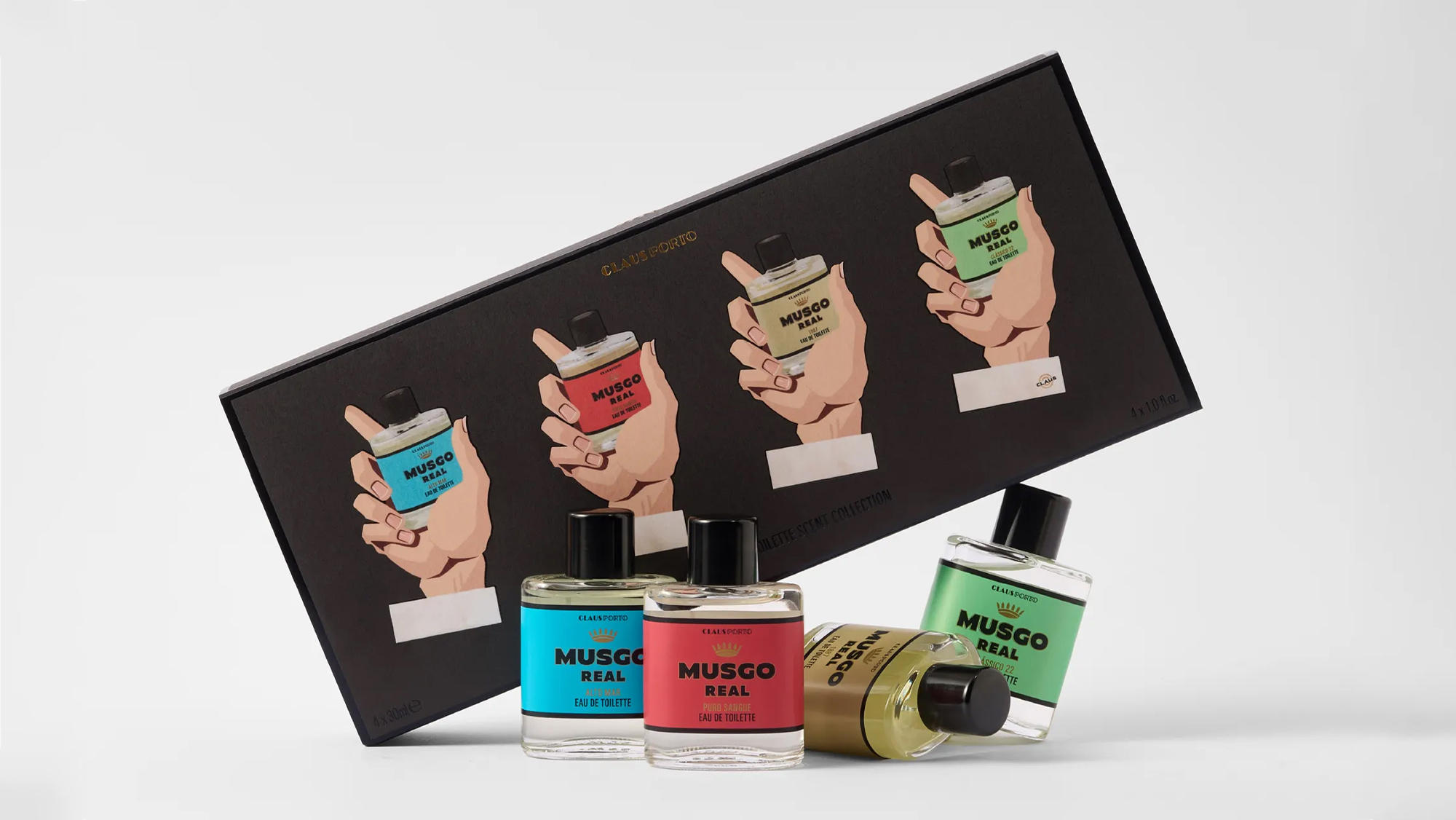 MUSGOシリーズのミニソープが5種類おさめられた「MUSGO REAL MINI SOAPS GIFT BOX」と、フレグランスが4種類おさめられた「MUSGO REAL GIFT SET HANDS UP MINI EDT」。