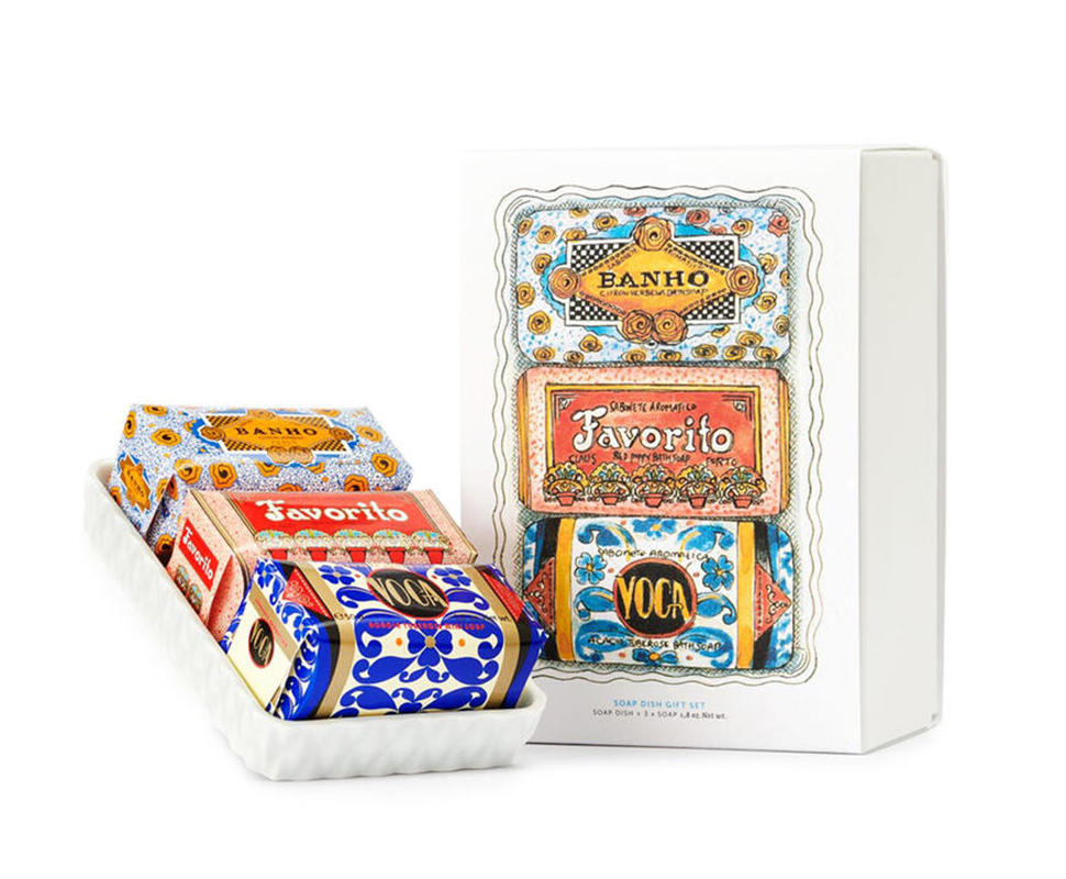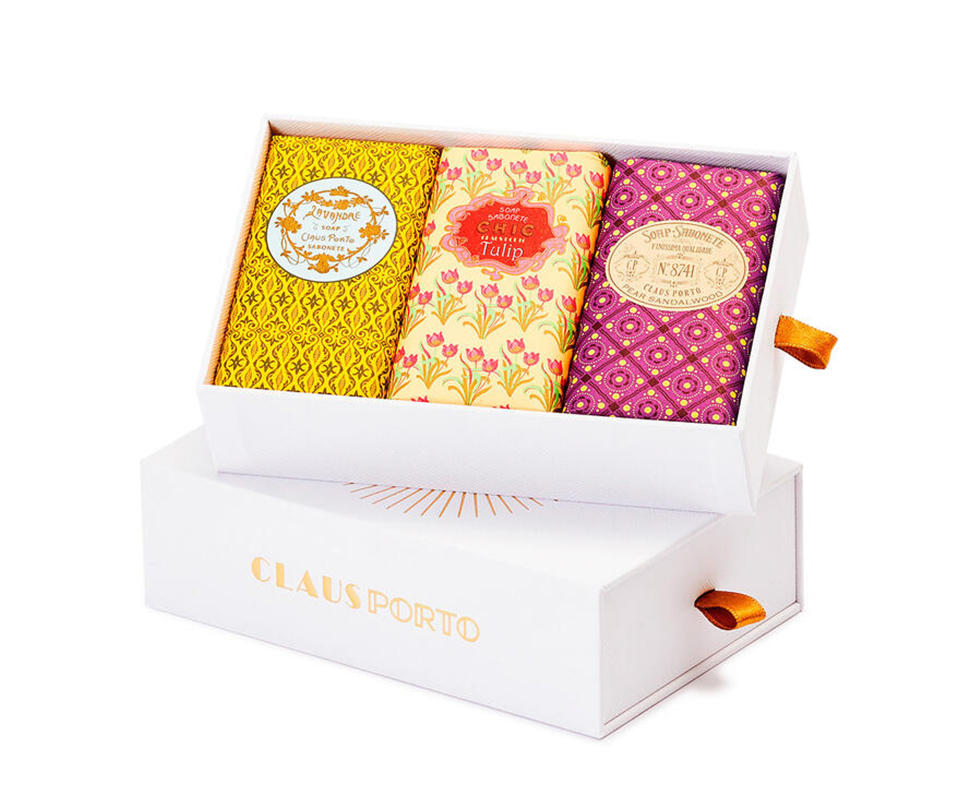クラシコ コレクションの3種類のソープとクラウス ポルトのソープのためにポルトガルで作られたエレガントな磁器製ソープディッシュのギフトセット。