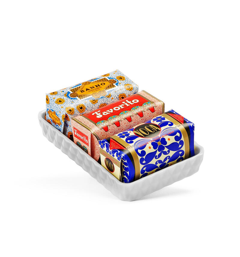 デココレクションの中から象徴的な3種類のミニソープと、上品なソープディッシュを組み合わせたギフトセットです。